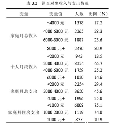 从表3.2可以看出,被调查家庭月收入水平主要在8000元及以上,被调查家庭月收入水平在4000-6000元之间,占28.3%,低于20%的月收入水平在4000元以下,个人净收入水平主要在2000-4000元之间。月家庭支出水平在2000-4000元之间的受访者比例为45.6%,而月家庭住房支出水平基本不超过1000元,占75.1%。