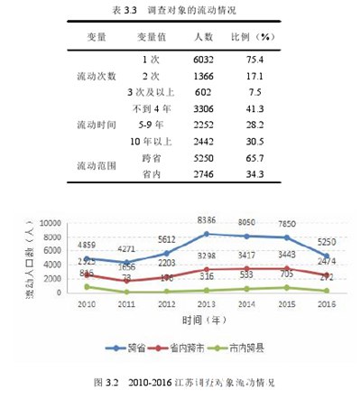 根据2016年调查数据,在调查对象中,流量基本为1个,占75.4%,流动时间不到4年,省际流量占65.7%,省内城际流量占30.9%,市内跨县流量占272个,占3.4%。(见表3.3和图3.2)。图3.2的结果显示,从2011年到2013年,全省样本量从8200个增加到12000个,说明江苏省人口流动频繁,全省流动人口呈现持续增长趋势。从2011年到2015年,各省之间的流动人口在经历快速增长后逐渐稳定。同时,由于省内区域经济发展不平衡,省内人口流动非常频繁,流动人口数量持续增长,2016年才开始下降。