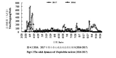 5月27日、7月4日、8月5日和9月4日(图4-2)。随着温度提升,2017年各代盛发期有提前发生的趋势。