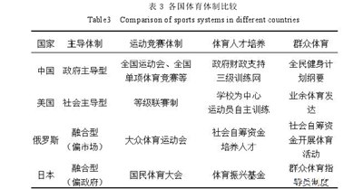 综上所述,从组织领导运行机制、人才培养模式、竞赛制度、群众体育管理等方面对我国体育体制与各有代表性的国家进行比较,可以做出全面的比较分析。比较如下: