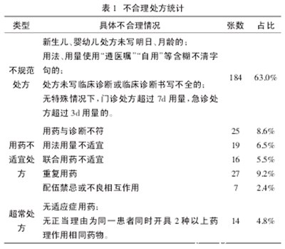 中成药不合理处方292张,占随机处方的8.11%。《处方点评管理条例(试行)》将不合理处方分为不规范处方、不恰当药品处方和不规范处方[2】。具体统计数据见表1。