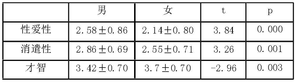 表1显示,男大学生在性和娱乐维度上的得分显著高于女大学生,在智力维度上的得分显著低于女大学生,差异具有统计学意义。