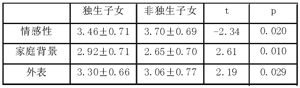 表2显示,独生子女在家庭背景和外貌方面得分显著高于非独生子女,在情感方面得分显著低于非独生子女,具有统计学显著差异。