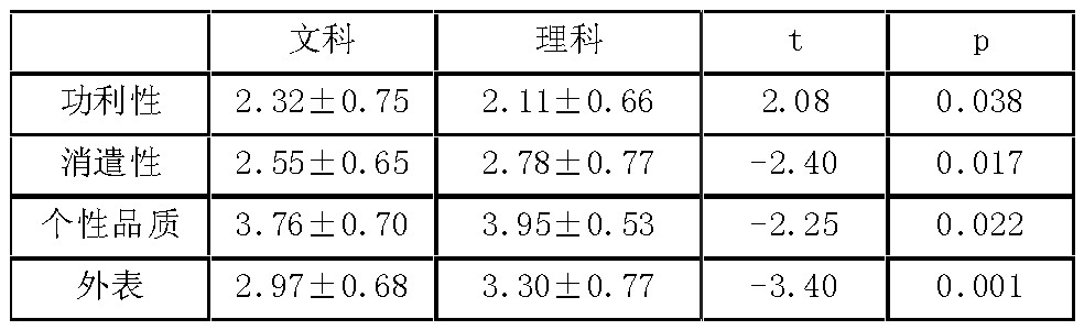 表3显示文科学生在功利维度上的得分明显高于理科学生,在娱乐、人格和外表维度上的得分明显低于理科学生,差异有统计学意义。