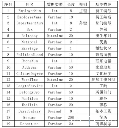 (1)员工基本信息表。保存员工类别的基本信息,具体描述见表1: