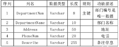 (2)部门信息表。它用于存储每个部门的信息。主键被设置为部门编号,并且可以唯一地确定一条部门信息。具体设计如表2所示。