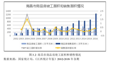 从图3.2可以看出,南昌市2002年商品房竣工面积为152.3万平方米,销售面积为108.9万平方米。然而,仅在两年内,2004年商品房竣工面积增长207.94%,达到426.4万平方米,销售面积增长147.93%,达到334.9万平方米。到2016年,商品房竣工面积将达到471.4万平方米,约为2002年的三倍,销售面积将达到1247.6万平方米,约为2002年的11倍。因此,南昌居民对住房的需求增长速度远远快于住房供应。