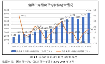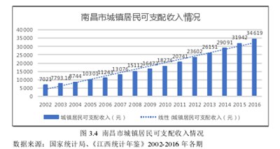 从图3.4可以看出,南昌市居民的收入水平在过去十年中稳步提高。2016年,城镇居民人均可支配收入约为2002年的五倍。2002年至2016年,南昌市城镇居民人均可支配收入年均增长率达到12%。因此,据推测,一旦人均可支配收入继续增加,居民的能力和生活质量将大大提高,住房需求也将进一步增加。