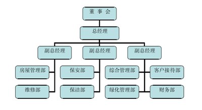 公司的组织结构分为一名总经理和三名副总经理。下设安保部、绿化管理部、保洁部、房管部、综合管理部、财务部、客户服务部、维修部等8个部门(如图)。公司坚决贯彻“面带微笑,服务至上”的服务理念,始终以业主利益为重。经过15年的发展,公司已经从简单的特殊服务发展到综合服务。公司一直秉承现代物业管理理念,追求以人为本、生态和谐管理的精髓,为业主提供高标准、标准化、人性化、专业化的服务,最大限度地实现业主、社会和企业的利益。