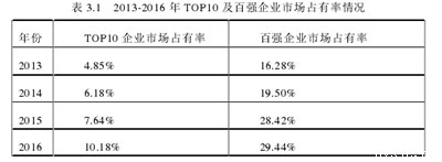 中国物业管理行业经过30多年的快速发展,已经呈现出以中小企业为主、大企业市场份额低的特点。总体而言,物业管理行业是劳动密集型的轻型资产行业。据统计,截至2016年底,该行业前10名企业的市场份额仅为10.8%,而前100名企业的市场份额仅为29.44%。(下表)在日益激烈的物业管理行业竞争中,规模较大的前100家企业的表现更加突出,呈现出强者和强者的特征。一方面,这是因为大型企业凭借其强大的财务实力和人脉,继续深入重点城市,并在二线和三线城市推出新的布局。另一方面,大型企业内部管理体系完善,可以在持续的规模扩张中复制成熟的管理标准,保证服务质量的稳定。同时,依托自身优势,采取差异化发展战略,不断抢占市场份额。