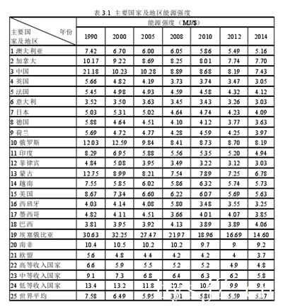 近年来,中国的能源效率有了很大提高。为了将中国的能源效率与国际水平进行比较,本文收集了1990年以后几个主要年份世界主要国家和地区的能源强度数据,单位为百万焦耳/美元。这些数据来自世界银行。数据收集结果如表3.1所示。