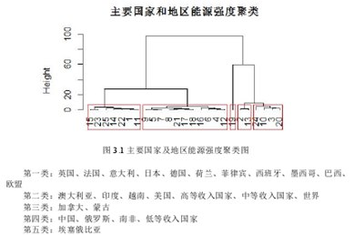 为了在国际比较中对中国的能源效率进行分类,并进一步阐明中国能源效率的国际水平,表3.1中的数据将汇总如下。由于偏差平方和反映了每个变量x与其数学期望e x之间的偏差程度,因此这里使用偏差平方和聚类方法,聚类结果如图3.1所示。