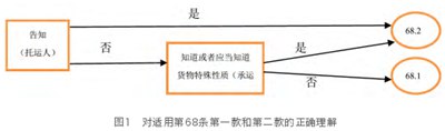 原因很简单。如果托运人未予通知,而承运人或实际承运人凭借其自身的运输经验知道货物的特殊性质,并且法律仍然给予承运人或实际承运人同样的处分货物的权利,则承运人或实际承运人可以出于自身利益考虑选择适用第六十八条第一款的规定并规避第二款。毕竟,当适用第2款时,承运人或实际承运人必须支付共同海损分摊额,并由于船舶价值较高而支付更多分摊额。这无疑是对滥用第1款的纵容。《汉堡规则》第13(3)款体现了这一精神。此外,如果承运人或实际承运人被赋予同样的处分货物的权利,无论他们是否知道货物的性质,也将与第六十八条第二款的适用相冲突。提交人认为,虽然第1款第一句的后半部分没有明确规定,但它与《汉堡规则》相同,意味着承运人或实际承运人不知道货物的性质。最近的《鹿特丹规则》显然遵循了此前关于这一点的规定。至于有些学者认为这不同于《海商法》,并建议在修订《[海商法》11时增加“承运人或履约方不能以其他方式知道危险货物的性质或特点”的要求,这是对该款的误读。因此,正确的理解应该如图1所示。