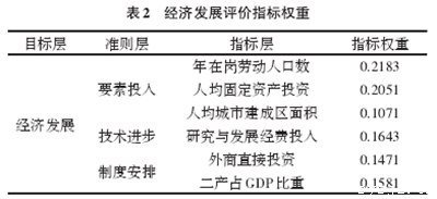 2.1.1.2经济发展评价指标体系和方法根据经济发展的内涵和影响因素,在参考作者已有成果和文章的基础上,从要素投入、技术进步和制度安排三个方面构建经济发展程度评价指标体系,然后根据专家打分法分别确定各指标的权重(见表2)。