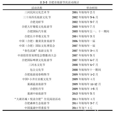 旅游节活动是旅游节活动的主要形式。近年来,合肥市规划并举办了一系列节庆活动,详见表3-3。