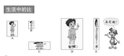 教科书情境的主要目的是什么?《教师教学参考书》描述如下:“为了让学生进一步发现矩形的形状可以用它的长度和宽度来表示,并进一步发现生活中有许多事物的属性像形状一样是不可测量的,但可以用两个可测量的等价量来比较。”也就是说,这个比率是通过比较两个量产生的。它描述了一种关系。为此,教师根据教材情况的目的和学生认知取向的特点,在教学中进行了补充介绍。
