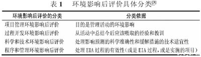 后环境影响评价是建设项目环境管理的新发展。其类别见表1。环境影响后评价主要包括四个方面:环境保护实施过程评价;环境效益评价;环境影响后评估和环境目标的可持续性评估。