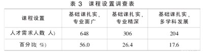 根据毕业生在学校的学习经历和实际工作的需要,我们将课程分为三类:扎实的基础课程和广泛的专业;基础课程扎实专业。基础课程是扎实的多学科[6】。调查结果见表3。
