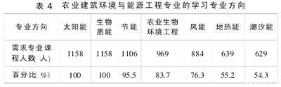 根据农业建筑环境与能源工程专业的特点,我们将该专业学生分为7个主要方向学习:太阳能、生物质能、节能、农业生物环境工程、风能、地热能和潮汐能。调查结果见表4。