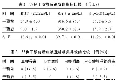 2.2 55 例干预前后肾功能指标比较(表 2) 患者干预后BUN、Scr、β2-MG 水平均明显低于干预前,差异有统计学意义。