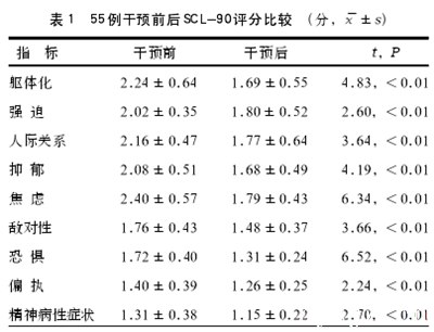 2.1 55 例干预前后 SCL-90 评分比较(表 1) 患者干预后躯体化、强迫、人际关系、抑郁、焦虑、敌对性、恐惧、偏执、精神病性症状评分均明显低于干预前,差异有统计学意义。