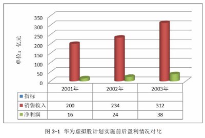 由于网络泡沫危机的影响,私营企业华为正努力筹集资金。面对科研投资和市场扩张资金的迫切需求,加上老员工分红增多、工作效率下降的趋势,华为于2001年7月推出了《华为技术有限公司虚拟股票期权计划管理暂行办法》,并开始实施虚拟限制性股票计划。与全员持股计划不同,华为此次给予激励目标的股息包括一定比例的固定股息和公司净资产增值部分对应虚拟股份的权益。因为它是一种虚拟股票,享受股权激励的员工没有所有权和投票权,也不允许将他们的股票转让给其他国家。员工离开华为后,他们的权益将自动消失,股份数量将被清算。此外,虚拟限制性股票计划(virtual restricted stock plan)的范围和重点有所不同,符合股权激励的员工的条件从“全年雇佣”改为“关键员工和关键员工”。这种激励制度在不改变公司自身控制的前提下,降低了原有骨干科研人员的积极性,同时保留了原有的人才,鼓励更多的高科技人才进入华为,使他们成为“奋斗者”,更好地为企业服务。如图3-1所示,华为的销售收入和净利润在虚拟限售股计划实施前后进行了明显对比。2001-2003年,华为的销售收入和净利润持续增长。截至2003年底,华为实现销售收入312亿元,净利润38亿元。与2001年相比,销售收入增长56%,净利润增长137.5%。由此可见,股权激励制度改革是适应华为现状的成功举措。股权激励实施后,华为的盈利能力显著提高。
