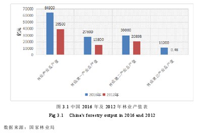 由图3.1可看出,中国林业总产值到2016年已经达到6.49万亿元,比2012年的3.95万亿元增加了2.54万亿元。林业三产都有不同幅度的增长,其中第三产业相较2012年增长了133%.森林旅游产业也已经成为了最具增长潜力的林业朝阳产业,其创造的社会综合产值由2012年的4400亿元增长到2016年的9500亿元。而这都是因为从2012年起我国采取的一系列林业相关政策,如接连停止天然林的商业性采伐,将发展森林旅游和林下经济等非木林产业代替国有林区才采伐产业。逐步深入林权制度改革,稳步发展林业产业,将农民拥有的林业资源产权和林地承包经营权变为农户创业的资本,林业产业带给农民致富的能力越发凸显,林业产业也逐渐成为实现脱贫攻坚的重要抓手。