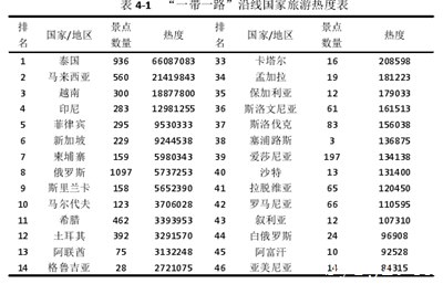 据国家旅游局称,沿线46个国家和地区与中国签订了免签证协议。中国公民可以享受沿途19个国家的入境签证政策。这些政策简化了入境手续,使游客能够快速进出中国和一些国家,节省了时间和成本,深化了旅游交流与合作,激活了旅游业的经济效益。马奥尼科姆旅游研究中心(Mahoneycomb Tourism Research Center)利用大数据,基于搜索流行度、评论和发表的游记数量等综合指标,分析中国对“一带一路”路线沿线国家的旅游流行度,如4-1“一带一路”路线沿线国家旅游流行度表所示: