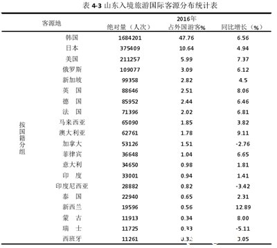 山东省入境旅游客源分布广泛,接待最多的是韩国,山东入境旅游国际客源分布如表4-3所示: