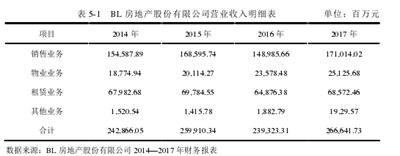 其中,代表企业价值;Rt表示企业在第三年的预期收入;r代表贴现率;t是预测的年度序列号;n是收入的术语;a是永久期的预期平均年收入,(即a是BL房地产有限公司2022年的预期收入)(1)营业收入预测BL房地产有限公司的营业收入预测主要包括两个部分:第一部分是预测2018年至2022年的营业收入,第二部分是预测2022年至永久期的营业收入。根据BL房地产有限公司2014年至2017年的财务数据,可以合理预测2018年至2022年的经营收入。