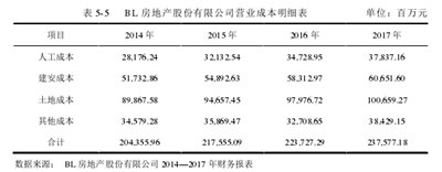(1)“企业对企业增长”后的经营成本预测BL房地产有限公司2014-2017年主要经营成本见下表5-5。
