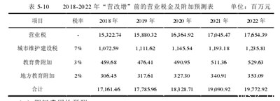 (3)营业税及附加预测①营业税及“营业税增加”后的附加预测可通过计算分析得出。2018年至2022年“营业税上调”后bl房地产有限公司营业税及附加预测详见下表5-9。