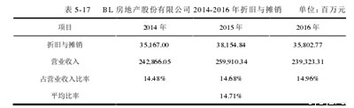 BL房地产有限公司的财务费用主要包括手续费、利息等。从BL房地产有限公司2014年至2017年的财务报表可以看出,BL房地产有限公司的销售费用分别占营业收入的1.38%、1.40%、1.46%和1.50%。显然,BL房地产有限公司的销售费用约占营业收入的1.38%-1.50%,并依次增加。因此,算术平均法可以用来预测。经计算,BL房地产有限公司2018年至2022年的财务成本为其营业收入的1.44%。