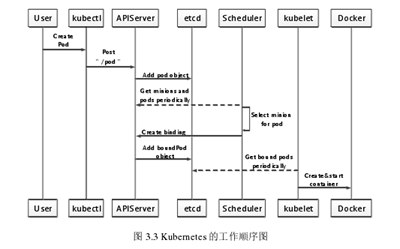 如图3.3所示,这是库本内斯核心组件工作的序列图。当用户向Kubernetes发送容器集群请求管理时,Pod首先被创建,然后kubectl向APIServer中的“/pod”节点发送post请求,以提供源容器配置文件。在应用编程接口验证库贝尔的成功请求后,它将执行一系列基本的源文件配置任务,并添加或创建一个用于调度后台工具(etcd)的pod接口。然后,在调度器将创建的pod接口绑定到etcd的后台管理架构之后,它可以执行kubelet的资源管理、调度、操作和同步更新。
