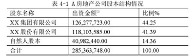 XX土地有限公司(以下简称“房地产公司”)成立于2005年6月。其注册地是四川省的地级市。公司员工约800人,由六个部门组成:销售部、市场部、人力资源部、财务部、项目部和行政部。注册资本为人民币2.8亿元。公司由出资126,727,772,300元的××集团有限公司、出资118,135,850元的××有限公司和出资40982,440万元的自然人股东组成。本公司各股东当前的出资及持股情况如下表所示: