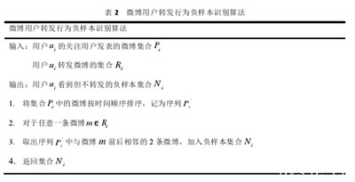 而用户转发微博的负样本识别比较困难,因为从数据集中无法直接判断用户不转发一条微博是因为不感兴趣,还是因为根本没有看到该微博。一般用户接收到的微博在其首页上以时间的倒序显示,他的关注用户后来发布的微博会覆盖时间更早的微博。因为用户使用微博的时间有限,微博内容的产生频率又极高,尤其对于关注人数上百上千的用户来讲,很可能因为信息过载错失感兴趣的消息。因此,用户没有转发一条微博,很可能是因为根本没有看到该条微博,这样的未转发记录不应该作为负样本。为了准确识别微博转发预测的负样本,本文以用户的转发动作为根据,定义了微博用户转发行为负样本识别算法,如表2所示,其基本思想为:若用户转发了一条微博,很可能在用户首页的微博列表上这条微博前后的2条微博用户也已经查看,这4条未转发的微博才定义为负样本。
