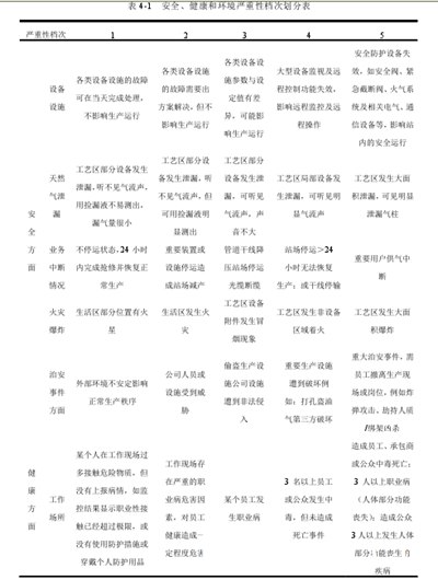 M天然气配气站最终实现了二级风险的排放,将二级风险分为五级,一级风险最弱,五级风险最强。每种类型的风险也会根据关注程度而耗尽。表4-1显示了安全、健康和环境严重程度的分类。
