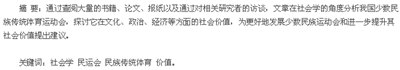 除汉族外,中国还有55个民族,其中蕴含着丰富的传统民族文化。这些文化都是各民族在社会发展过程中积累的宝贵财富。少数民族体育作为各民族传统文化中的“身体符号”,在发展过程中发挥着非常重要的作用。从少数民族传统体育的本质精神可以看出,他更注重娱乐、参与等,这对锻炼生活、提高人格起到了积极的作用。随着我国少数民族体育文化在各自的历史发展过程中与当时的社会环境、人文环境和地理环境相结合而演变,这些民族传统体育是我国少数民族不同阶段发展的结晶。观众通过观看少数民族体育相关项目的表演和比赛,可以感受到这一民族体育活动起源的时代。因此,这些少数民族传统体育文化都蕴含着他们民族文化的结晶。