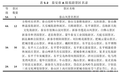 “吸引人靠泰山,留住人靠泰城”近年来,泰安市策划了很多旅游项目,全市A级旅游景区57家,其中5A级1家,4A级12家,3A级30家,2A级14家,作为与泰山配套的景区、景点。如表5-2所示: