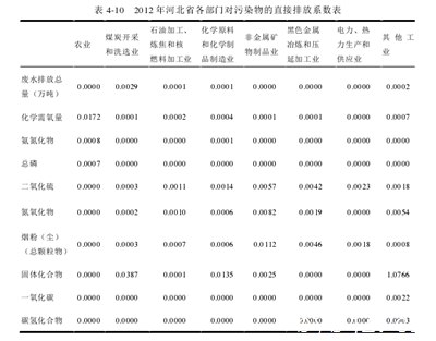 根据河北省10个部门2012年和2015年的投入产出表,可以计算出国民经济各部门污染物的直接排放系数和完全排放系数指数,从而分析高污染部门的排污情况,揭示它们之间的关联程度。