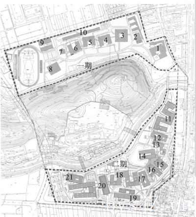 象山校区位于杭州南部群山的东部边缘。它被香山环绕,高约50米,北面和南面有两条小河。校园建设分为两个阶段。香山北侧的第一期工程始于2001年,于2004年竣工。它包括10座建筑和2座廊桥,面积约70,000平方米。南区项目的第二阶段始于2004年,于2007年完成,也包括10栋建筑和2座盖梁,面积近80 000平方米(见图1)。