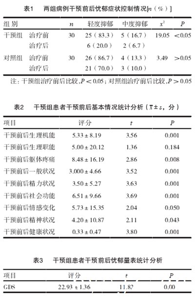 1.2.6评分结果干预组:轻度抑郁25例,占83.3%,中度抑郁5例,占16.7%。对照组:轻度抑郁症26例,占86.7%,中度抑郁症4例,占13.3%。