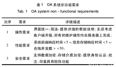 非功能性需求需要从三个方面进行分析:操作需求、性能需求和安全需求。根据需求调查结果,总结出办公自动化系统应满足的非功能性需求,如表1所示。