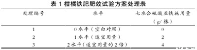 铁肥是最先被确认的植物必需营养元素之一[1],柑橘是属于对铁敏感的作物[2],柑橘树缺铁黄化现象比较普遍,严重影响柑橘的产量和品质1材料和方法,为进一步摸清我县柑橘中微量元素临界值、潜在缺素面积以及中微量元素肥料的推荐施用量,2014年,田林县农业局结合农业部测土配方施肥补贴项目建设的要求,在田林县六隆镇周马村周马屯进行了柑橘铁肥肥效小区试验,现将试验情况报告如下: