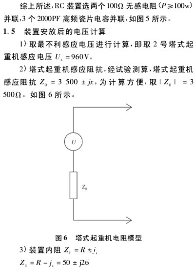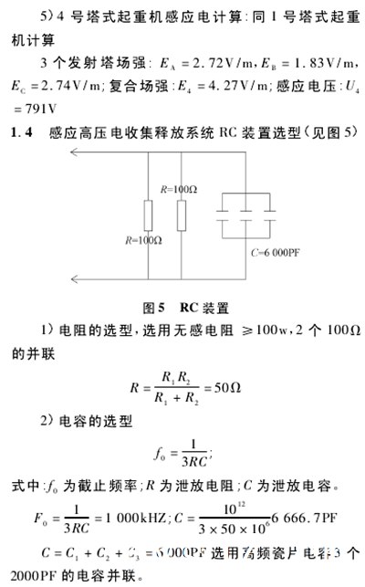 感应高压集放电装置是内置电阻和电容并联的组合箱体。根据在电磁辐射发射源附近建造的塔式起重机的感应特性,采用谐振电路衰减装置,即用导线将塔式起重机臂端连接到塔式起重机底部,并连接电容器装置,从参数配置中避开谐振点,使电路脱离谐振状态,从而抵消或降低塔式起重机上感应的高电压(见图3)。