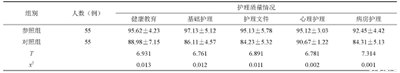 摘要:目的在儿科护理管理中采取风险预防护理措施,并分析其应用效果。方法选取我院110例儿童,随机分为对照组和对照组,每组55例。对照组给予常规护理,对照组给予风险预防护理,观察两组的各项护理指标。结果参考组健康教育、基础护理、护理文件和心理护理质量得分均优于对照组。相比之下,这种差异是显而易见的,具有统计学意义。参照组事故1例,静脉留置针1例,护理风险发生率为3.64%。对照组用药问题1例,事故2例,静脉留置针4例,发生率为12.73%。相比之下,差异显著且具有统计学意义(关键词:风险预防护理;儿科护理管理;应用效果;