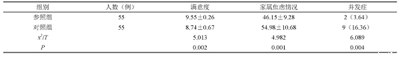 参照组满意度为 (9.55±0.2 6) , 高于对照组的 (8.74±0.67) , 参照组的家属焦虑情况为 (46.15±9.28) , 低于对照组的 (54.98±10.68) , 参照在的并发症率为3.64%, 低于对照组的16.36%, 两者相比, 差异明显, 有统计学意义 (P